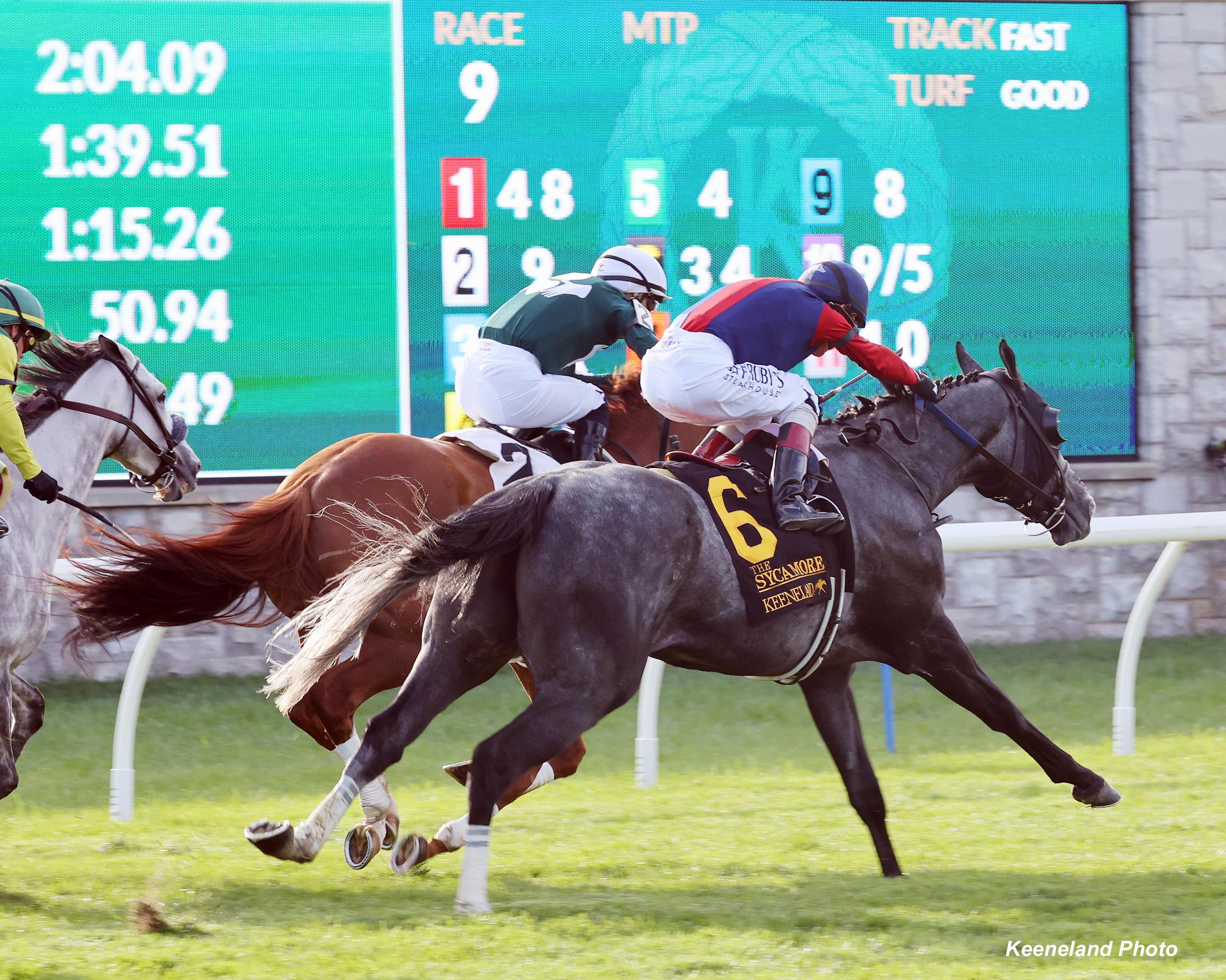 LEXINGTON, Ky. – Stonelea Stables and Bonnie Rye Stable’s Desvio rallied from far off the pace at 34-1 to post a half-length victory over Safe Trip Home to win the 31st running of the $400,000 Sycamore (G2) for 3-year-olds and up Friday afternoon.