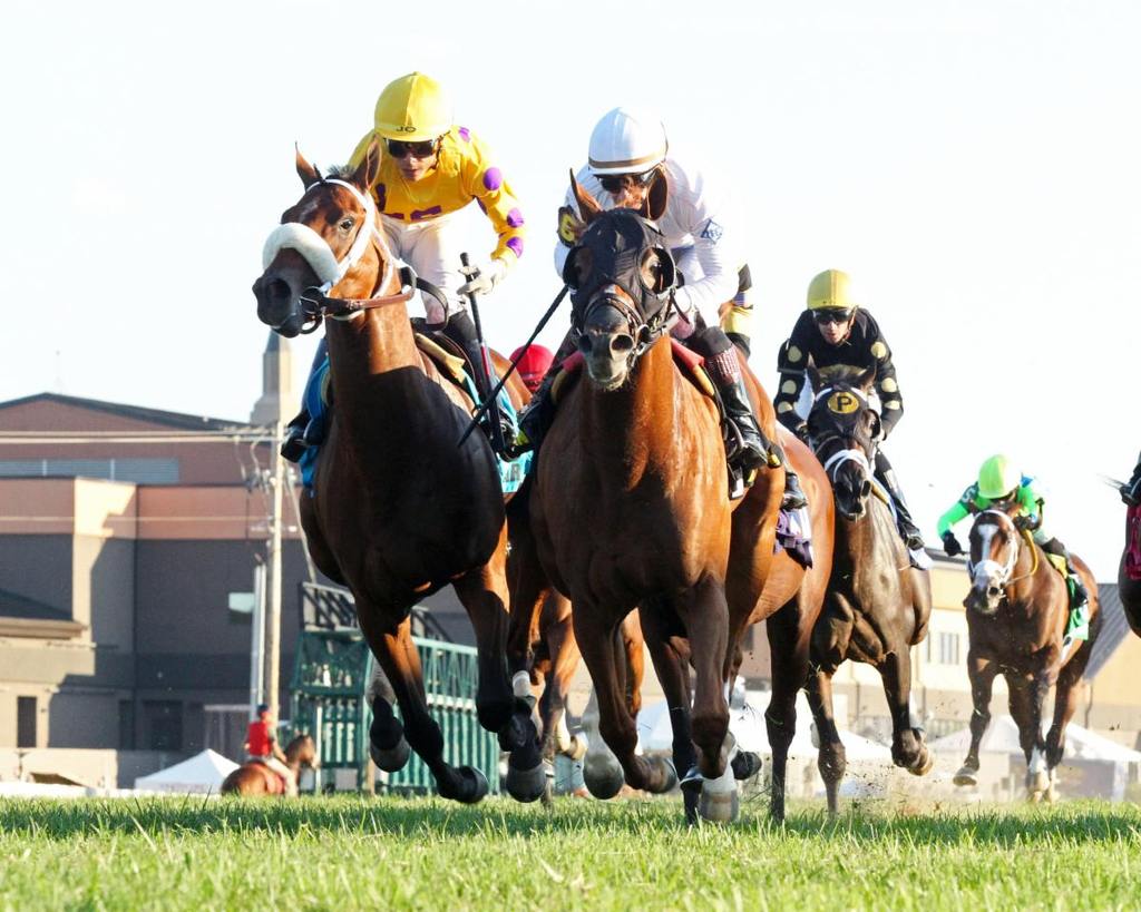 Anglophile (inside) held off the oncoming Far Bridge in the $1 million National Thoroughbred League Dueling Grounds Derby. (Coady Photography)