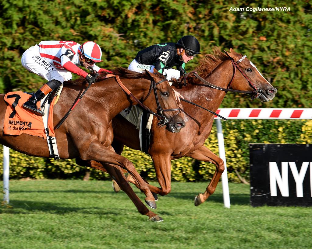 OZONE PARK, N.Y. – Woodford Thoroughbreds’ Aussie Girl held off a challenge from the favored Tax Implications to win Sunday’s Listed $150,000 Noble Damsel, a one-mile inner turf test for fillies and mares 3-years-old and up, at Belmont at the Big A.
