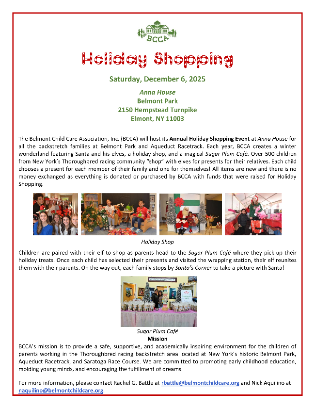ELMONT, N.Y. – The Belmont Child Care Association, Inc. (BCCA) is bringing the magic of the holiday season to life once again with our much-loved Annual Holiday Shopping Day on Saturday, December 6, 2025, at Anna House, BCCA’s child care center located at Belmont Park.