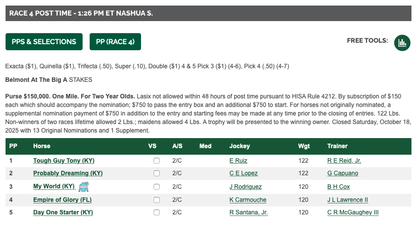 The Nashua is slated as Race 4 on Saturday’s 10-race card, which also features the Listed $150,000 Aqueduct Turf Sprint Championship in Race 9. First post is 12:05 p.m. Eastern.