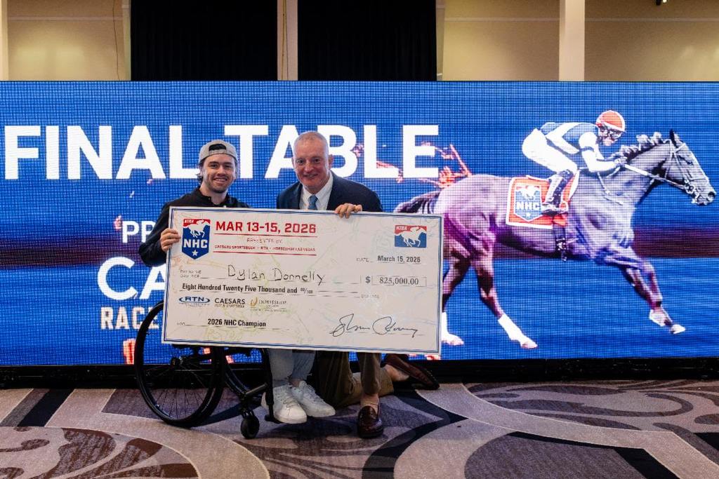 Las Vegas — Winning the last race at the Final Table, Dylan Donnelly of Rancho Cucamonga, CA, captured the 27th NTRA National Horseplayers Championship, presented by Caesars Race & Sportsbook, Horseshoe Las Vegas and Racetrack Television Network (RTN). With the dramatic victory at the Horseshoe Events Center, Donnelly earned the first-place prize of $825,000, an Eclipse Award as the Horseplayer of the Year, and a return trip to next year’s NHC.
