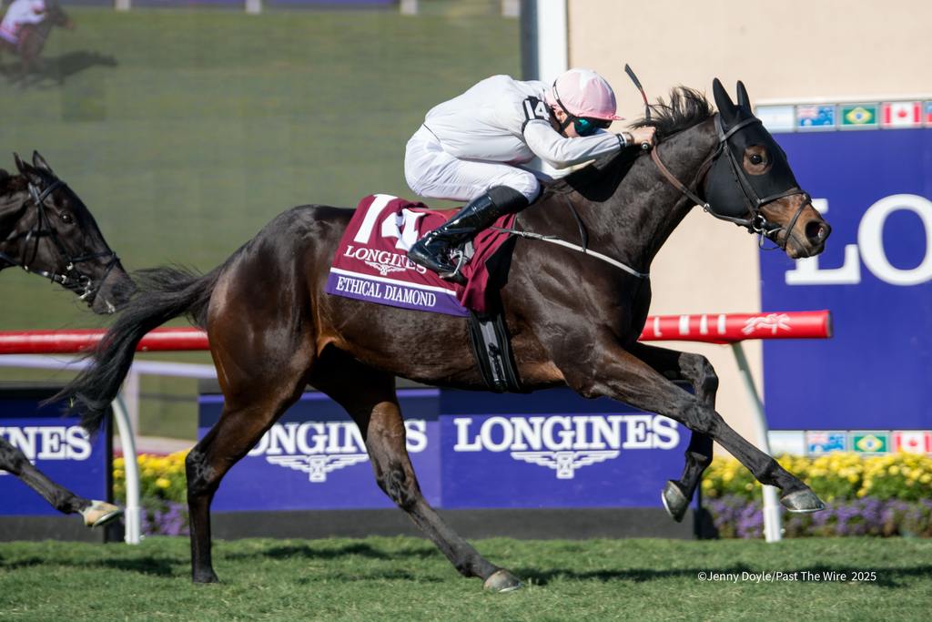 DEL MAR, Calif. – H O S Syndicate’s Ethical Diamond (IRE) ($57.40) launched a huge run from the back of the pack to post a 1 ¼-length victory over two-time race winner Rebel’s Romance (IRE) to capture the 42nd running of the $5 million Longines Breeders’ Cup Turf (G1) for 3-year-olds and up at Del Mar Saturday afternoon.