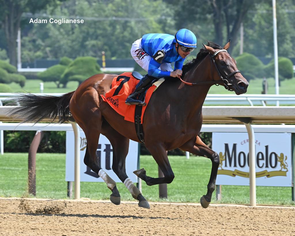 Jody’s Pride burst onto the scene this summer at Saratoga Race Course when breaking her maiden by 10 1/2 lengths in an off-the-turf maiden special weight on August 9 for trainer Jorge Abreu. The daughter of 2015 Triple Crown winner American Pharoah dueled to the outside of Mia Marcela through a sharp opening quarter-mile in 21.89 seconds before spurting clear in the stretch drive and crossing the wire in hand under Flavien Prat, who retains the mount from post 7. The effort garnered a 68 Beyer Speed Figure.
