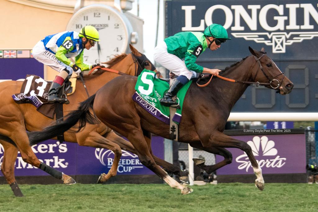 DEL MAR, Calif. – Peter Brant’s Gezora (FR) ($20.20) surged past She Feels Pretty in deep stretch to post a half-length victory in the 27th running of the $2 million Maker’s Mark Breeders’ Cup Filly & Mare Turf (G1) at Del Mar to close out the 42nd World Championships.