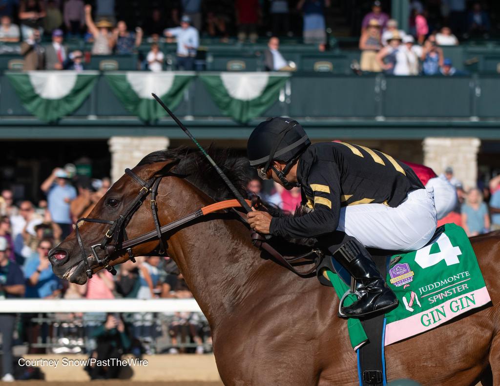 LEXINGTON, Ky. – Calumet Farm’s homebred Gin Gin went right to the front and then held off Nitrogen by a head to win the 70th running of the $650,000 Juddmonte Spinster (G1) for fillies and mares on Sunday afternoon at Keeneland as reigning Horse of the Year Thorpedo Anna finished fourth.