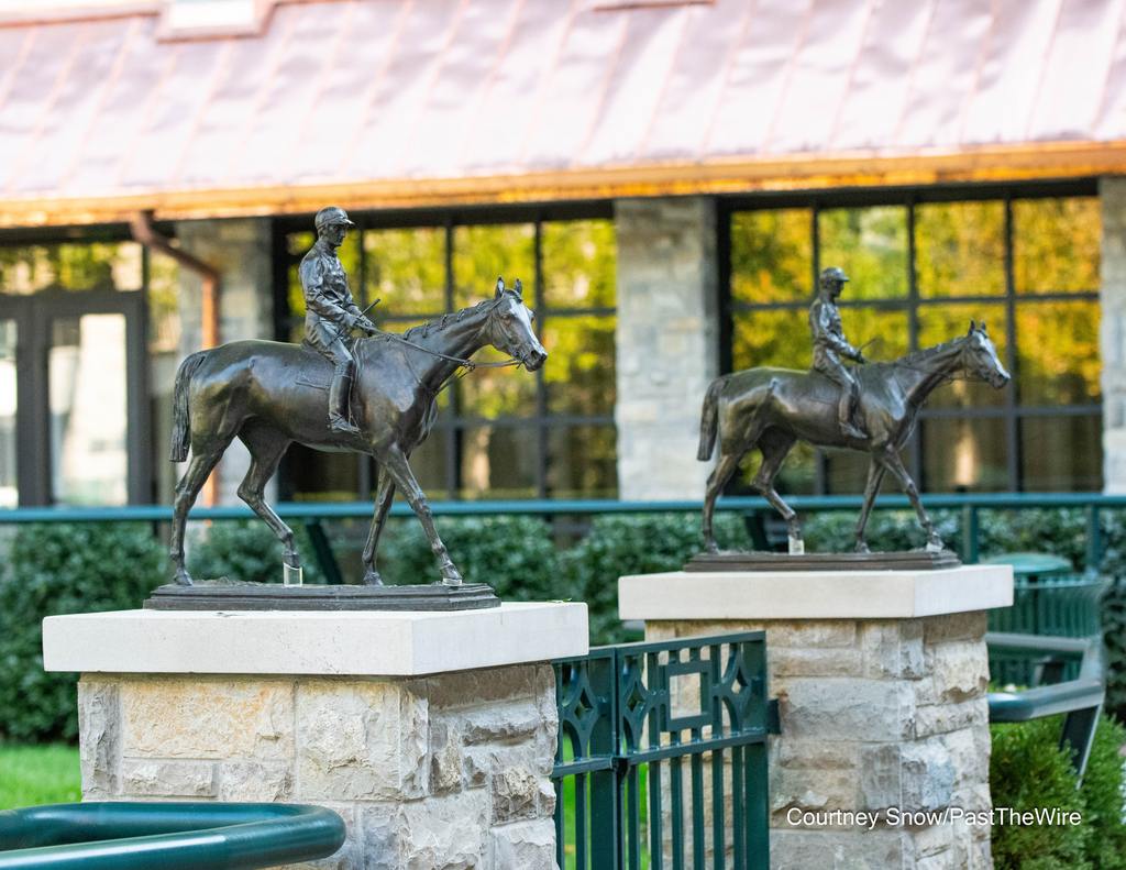 The bronzes once stood at Keeneland on limestone piers inside the East entrance at the entry to the Paddock.