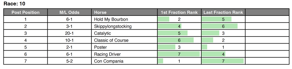 Hold My Bourbon answered part of that question quickly by gunning hard from the rail. But Pace Points already hinted at the risk. While ranked highly early, his profile suggested limited staying power, and once the fractions clicked off in 22-and-change and sub-46 to the half, the writing was on the wall. That kind of pace almost always invites pressure.