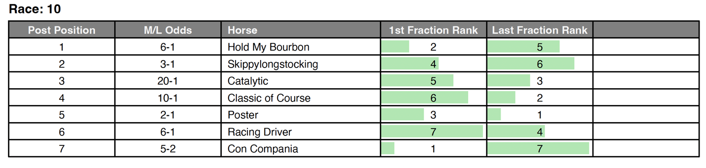 Hold My Bourbon answered part of that question quickly by gunning hard from the rail. But Pace Points already hinted at the risk. While ranked highly early, his profile suggested limited staying power, and once the fractions clicked off in 22-and-change and sub-46 to the half, the writing was on the wall. That kind of pace almost always invites pressure.
