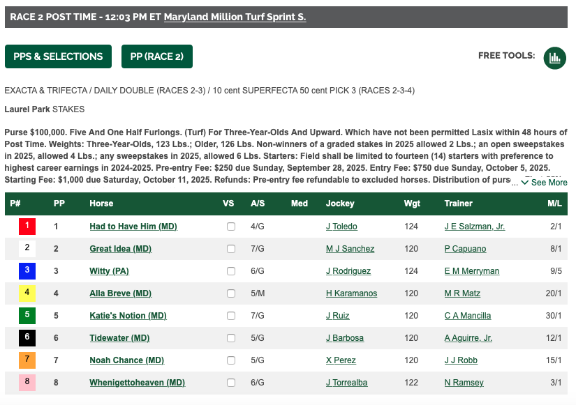 Special first post for the 12-race program is 11:30 a.m. ET. Gates open at 10:00 a.m. ET. On the wagering side, Laurel Park offers two “Value Pick 5” wagers, each with a low 12% takeout rate. The Early “Value Pick 5” spans races 1 through 5, while the Late “Value Pick 5” sequence comprises races 8 through 12. Additionally, races 9 through 12 make up an All-Stakes Pick 4 wager with an estimated $100,000 pool.