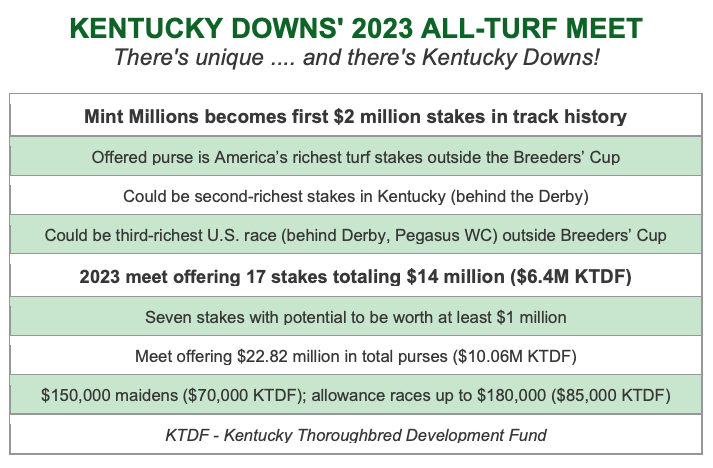The six other graded stakes offering $1 million in available purses are the Kentucky Turf Cup (Grade 2) at 1 1/2 miles, Kentucky Downs Turf Sprint (G2), Franklin-Simpson (G2) for 3-year-old sprinters, The Mint Ladies Sprint (G2), Kentucky Downs Ladies Turf (G3) and the Kentucky Downs Ladies Marathon (G3). Those stakes, all carded for the blockbuster Saturday Sept. 9 program, will have base purses of $600,000 with another $400,000 available for KTDF-eligible horses, which reflect the vast majority of horses racing at Kentucky Downs.