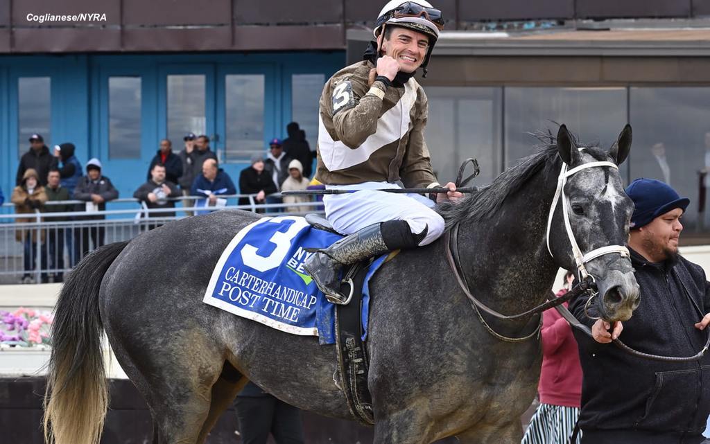 Post Time with Sheldon Russell all smiles after their Carter victory. (Coglianese/NYRA)