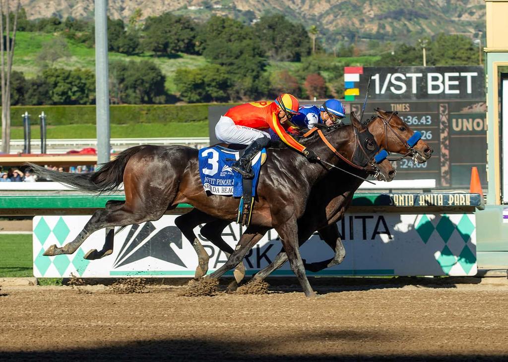 ARCADIA, CA —Grade I-winning stablemates Nysos and Nevada Beach put on a show for the opening day crowd at Santa Anita Park Sunday in the Grade II, $200,000 Laffit Pincay Jr. Stakes going 1 1/16 miles on dirt. Following a thrilling stretch duel, Nysos edged Nevada Beach by a head on the wire to prevail as the heavy 1-5 favorite. The top two finishers are both trained by Hall of Famer Bob Baffert.