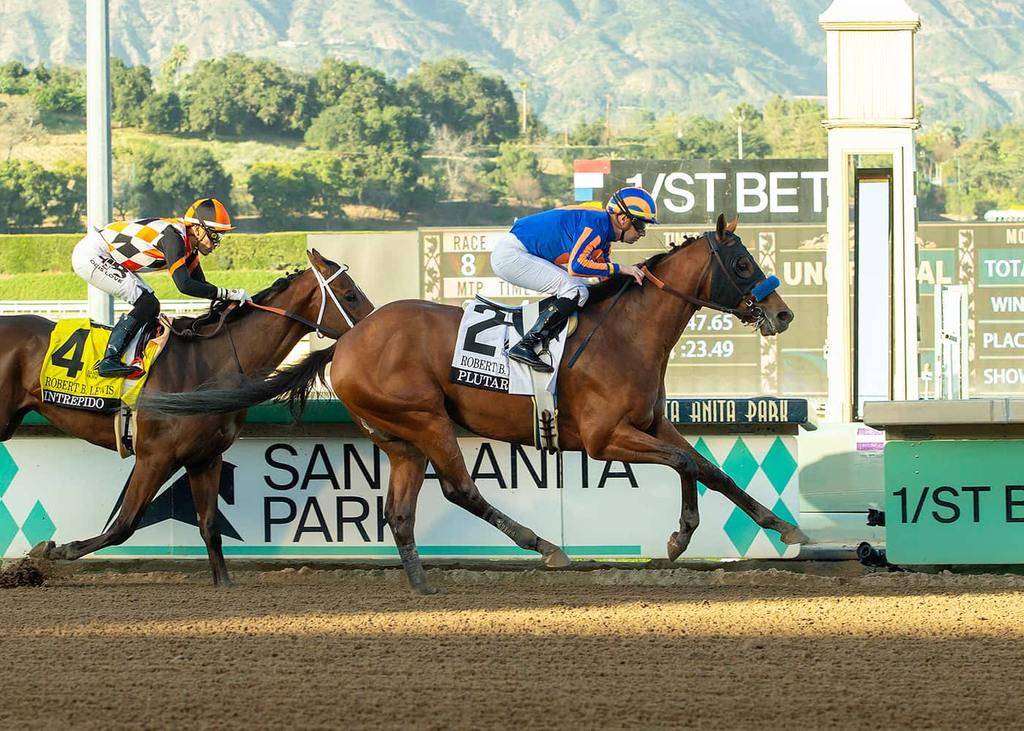 ARCADIA, CA —Plutarch became Hall of Fame trainer Bob Baffert’s latest winner of the Grade III Robert B. Lewis Stakes Saturday when edging away late from a game Intrepido in the one-mile race for 3-year-olds at Santa Anita. It was Baffert’s eight straight win in the Lewis and 14th overall.