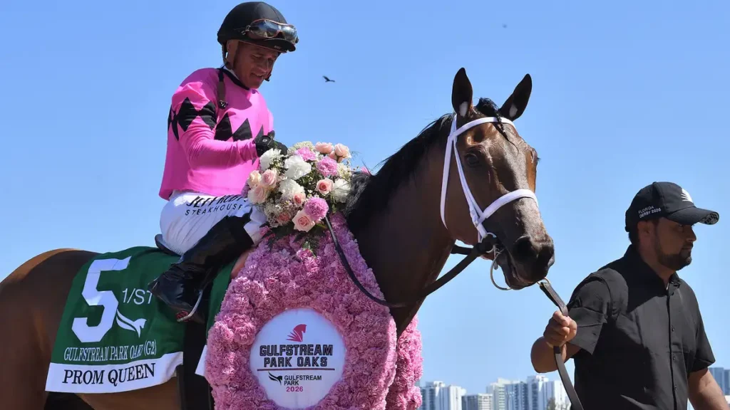 Ridden by Hall of Famer Javier Castellano for trainer Brad Cox, Prom Queen ($8.20) covered a fast main track in 1:44.40 to earn her first points and move into a tie for third place on the Oaks list. It was the first Gulfstream Park Oaks win for Cox, who is a three-time winner of the Kentucky Oaks, most recently in 2025 with Good Cheer.