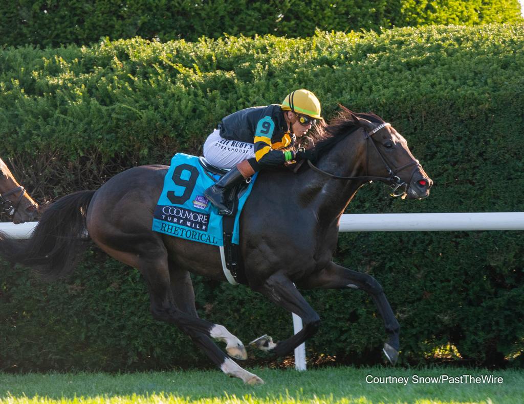 LEXINGTON, Ky.—Gary Barber, Cheyenne Stable and Wachtel Stable’s Rhetorical rocketed past front-running Quatrocento at the eighth pole en route to a three-quarters of a length victory over Program Trading (GB) to win the 40th running of the $1.25 million Coolmore Turf Mile (G1) for 3-year-olds and up Saturday afternoon at Keeneland.