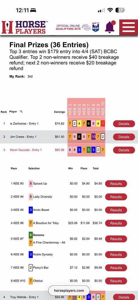 Probably a little too much information, especially to start off the article but I went for a colonoscopy today, and as degen as it sounds one of the last things I did before going back for my 1pm colonoscopy was finalize my selections for a BCBC Qualifier. I didn’t have time for an article prior as I was a little tied up in the john most of the day Thursday. Anyway, I had a good day overall today at Keeneland, i nailed a big price with A Bourbon for Toby and benefited on another thanks to Joel Rosario almost putting Flavian Prat through the rail which opened it up for the 7 in the Beaumont. Percy’s Bar was the final bump I needed into the top 3.