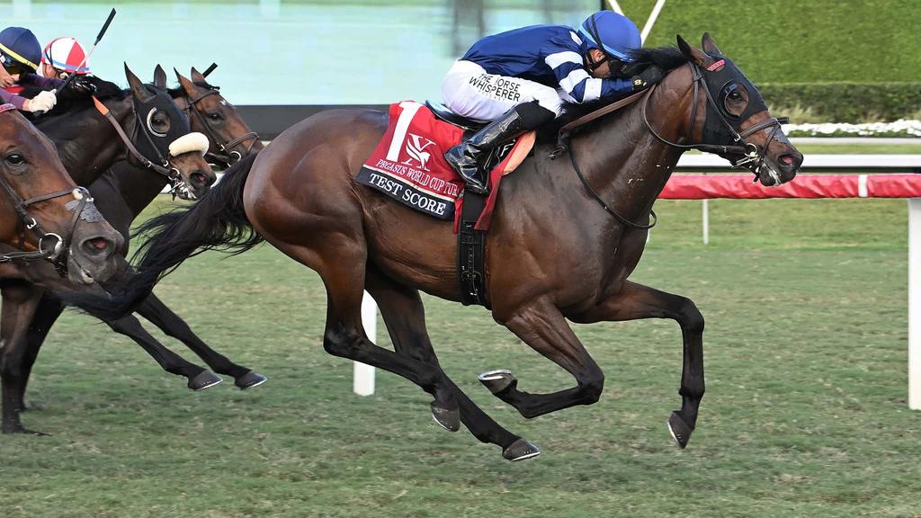 Test Score was facing older horses for the first time in the Pegasus Turf after notching three wins, one second, three thirds and more than $1.3 million in purse earnings from eight starts at 3 dating back to last February including victories in the Belmont Derby Invitational (G1), Twilight Derby (G2) and Transylvania (G3).