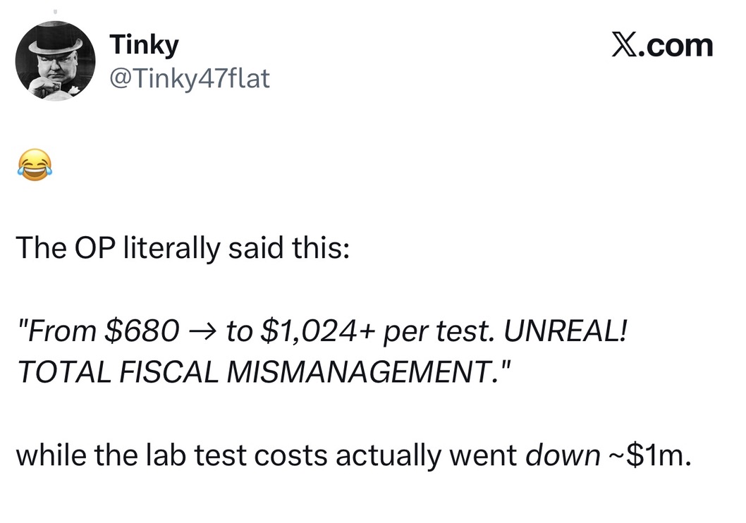 To suggest we should ignore the overhead required to deliver that test is like a restaurant charging you $100 for a burger and telling you it’s a bargain because the meat only cost $5. We are paying for the building, the waiters, and the owner’s legal fees.