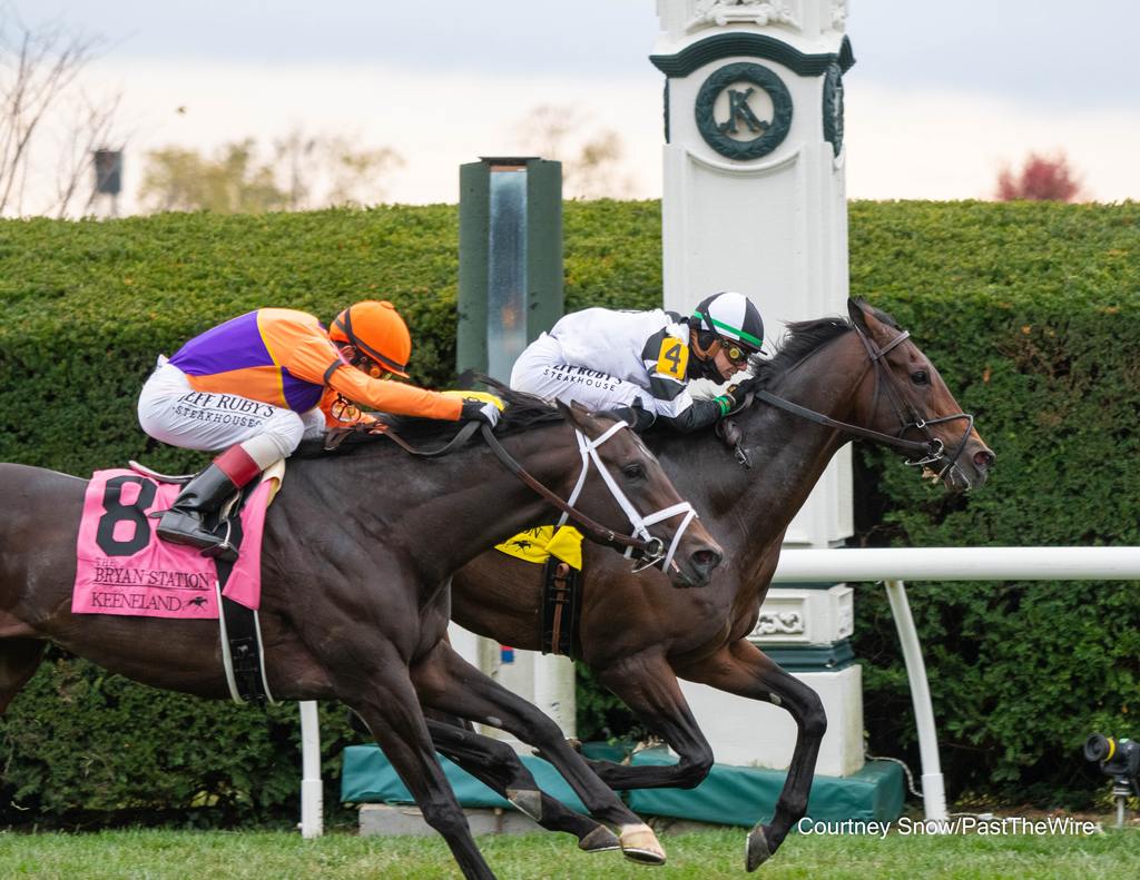 LEXINGTON, Ky. – Donamire Farm’s homebred Troubleshooting passed early leader Golden Afternoon on the final turn and then held off a rallying Tenacious Leader by a neck at the finish to win the $600,000 Bryan Station (G3), the second of three stakes on Saturday’s closing day of the Fall Meet at Keeneland.