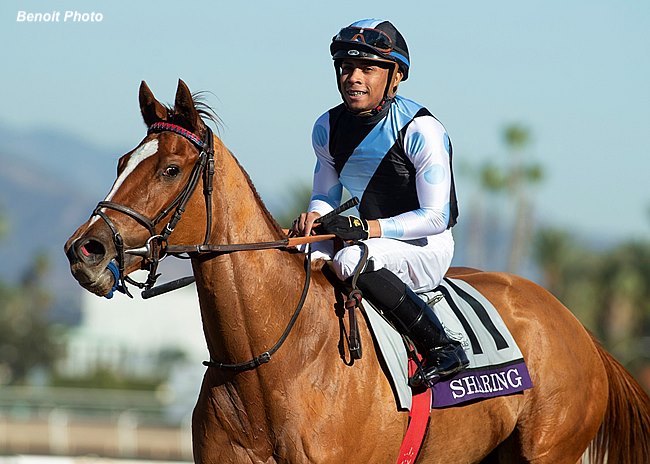 Sharing winning the 2019 BC Juvenile Fillies Turf. (Courtesy of the Breeders’ Cup)