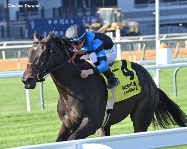 Village Voice winning the Waya at Belmont at the Big A. (Chelsea Durand)